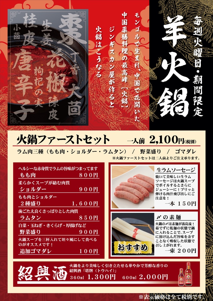 ※火鍋は火曜日以外、要事前予約となります。