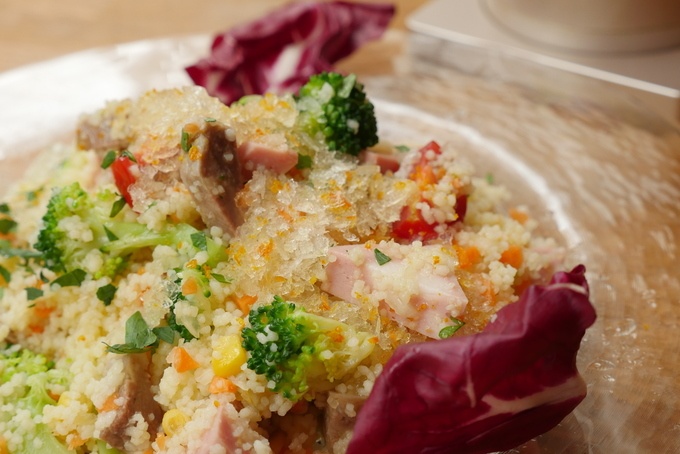 世界最小のパスタともいわれるクスクスのプチプチとした食感と、噛みごたえのあるハムの美味しさを、ひんやりとしたコンソメが引き立てるさっぱりとしたサラダ風の一品に仕上がっています。