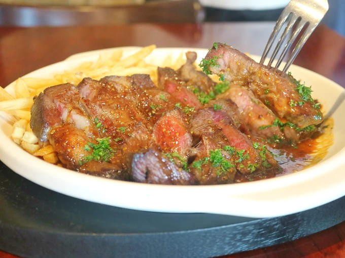 一口サイズにカットされたステーキとポテトを熱々のまま頂きます。ステーキには程よい脂がついており、食べると甘みがジュワっと口の中に広がります。