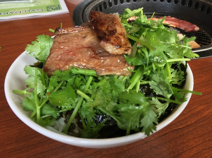 まずはこちら、おなじみの「カルビ専用ごはん」です。ごはんの上に海苔やゴマ、特製のタレがかかっているですが、パクチーをのせると一面緑に…