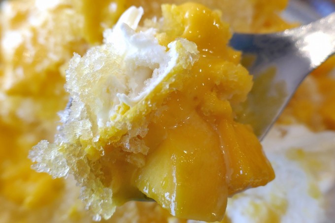 かき氷をベースにマンゴーミルクソース、マンゴー果肉、バニラアイスクリームを一緒にして食べてみると、まるでケーキのような力強い甘味とコクが感じられて驚きました!