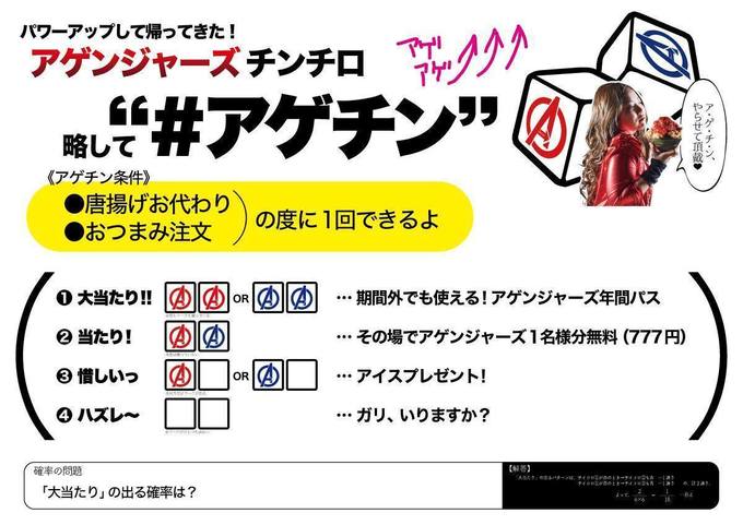 今回も唐揚げやおつまみを注文1回につき、アゲンジャーズチンチロが1回遊べます!