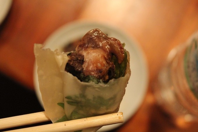 こちらの赤貝は、ショウガ醤油・紹興酒・ごま油・砂糖・塩で味付け。濃厚な旨味の中に苦味もありますが、それを包む大葉が爽やかな後味を残します。