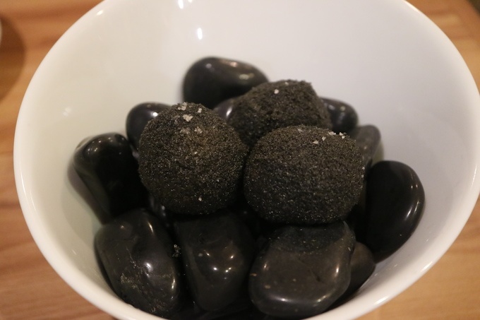 テーブルに運ばれてきた瞬間トリュフの豊かな香りを感じることができます。温めた石を下に敷くことで、料理が冷めにくく香りが保たれるそうです。衣はサクッと薄いので何個でも食べられそう…