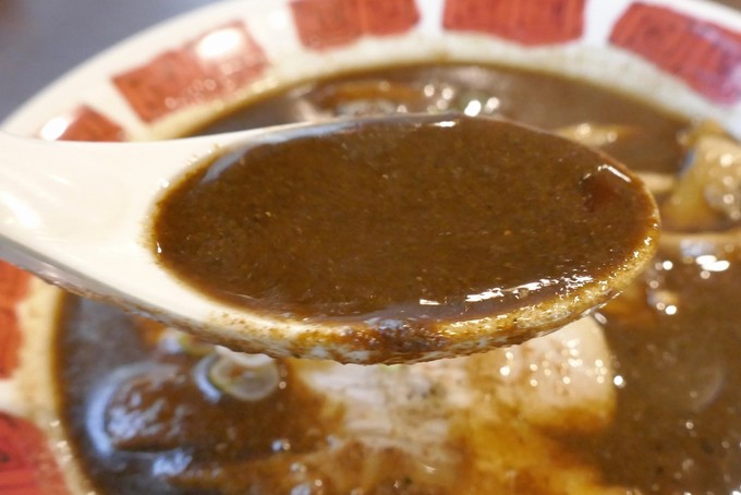 『バーミヤン』の「富山ブラックラーメン」のスープ表面には魚粉が浮いており、一般的に知られる「富山ブラックラーメン」とはまるで雰囲気が異なる『バーミヤン』仕様な一品。