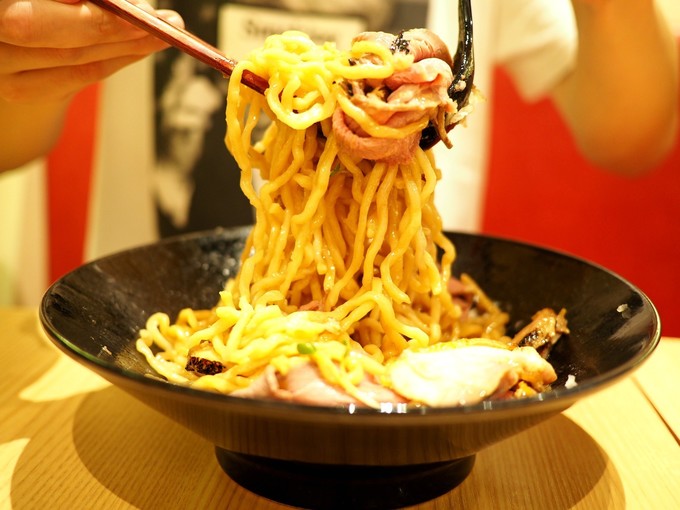 濃厚なソースとブラックペッパー、とろりとした半熟卵がカルボナーラをイメージさせ、他のメニューとはひと味違う洋風の油そばです。