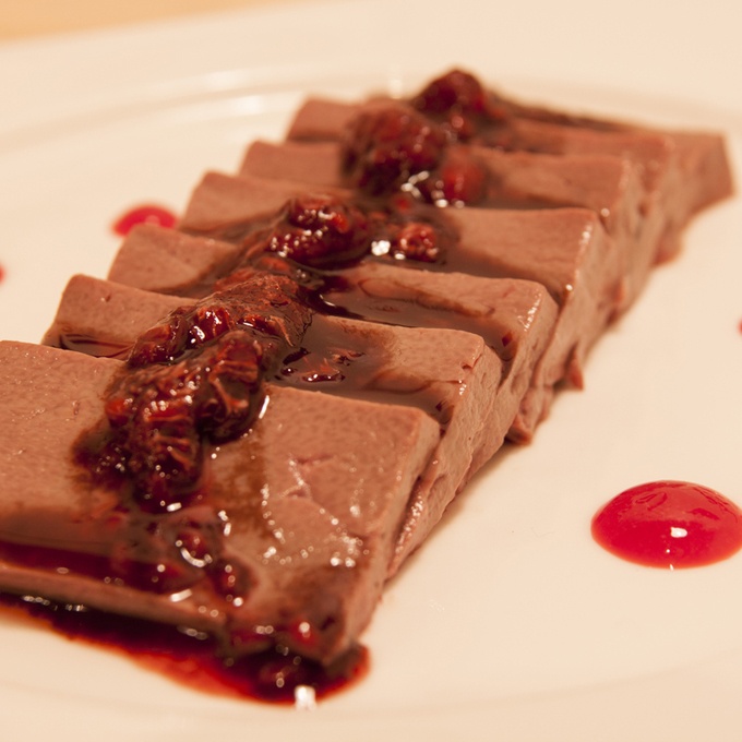 レバーの上からは、フランボワーズとお醤油とビンコットソース(フランボワーズフレーバー)で作ったソースがかけられています。