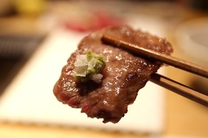 こちらは醤油ダレで味付けされた「ザブトン」です。両面をサッと炙って、薄いピンク色になったところでいただきます。サシの入った部位なので醤油との相性がよく、噛めば噛むほどより甘みを感じることが出来ました。