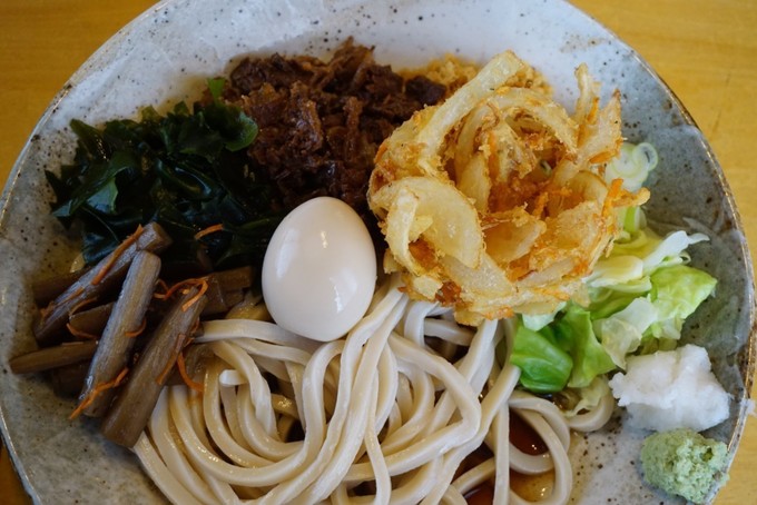 トッピングはゴボウ、わかめ、馬肉、かき揚げ、キャベツ、煮玉子がのっています。