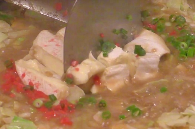 しっかり全体を混ぜていくと、もんじゃと言うより麻婆豆腐のような見た目に。
