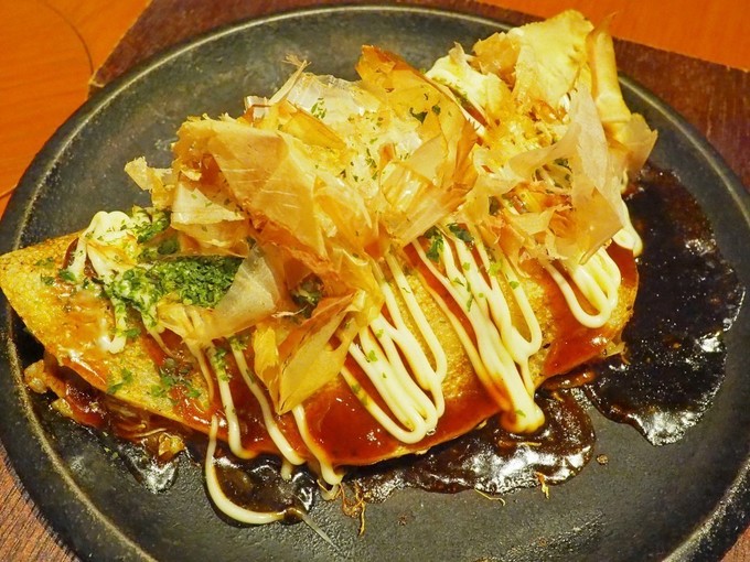 材料だけ見るとお好み焼きのような印象を受けますが、薄い生地で包んでいるので、お好み焼きよりも軽い食べ応えになっており、どんどんお箸が進みます。