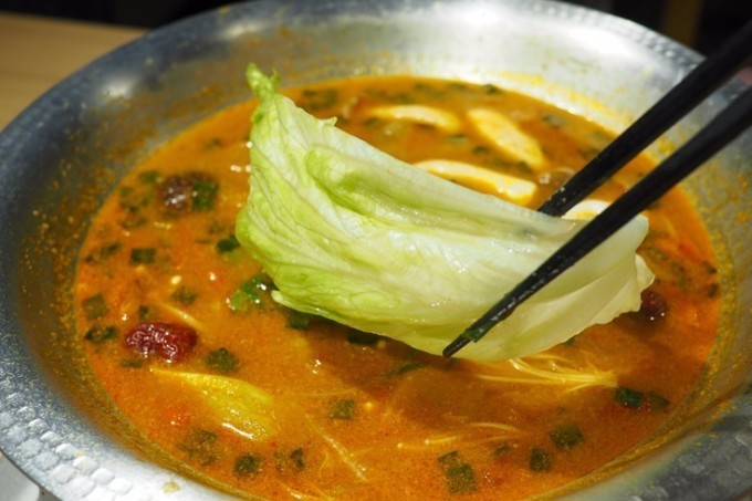 レタスが透き通るくらいに火が通ったらいただきましょう。レタスはみずみずしいので、旨辛の薬膳スープと相性抜群ですよ。