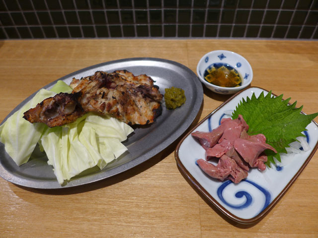 右:低温調理のとろとろレバ刺し。左:大山鶏を豪快に焼いた酒津屋名物骨付きもも一本焼き