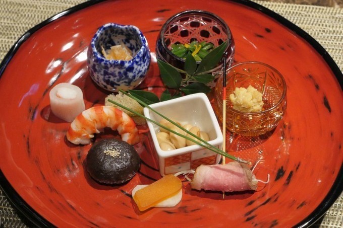 「季節の八寸盛り合わせ」は、「海老」や「子持ち昆布」、「豆酩(とうべい)」、「みぶ菜浸し」など、季節の食材を少しずつ味わうことが出来ます。