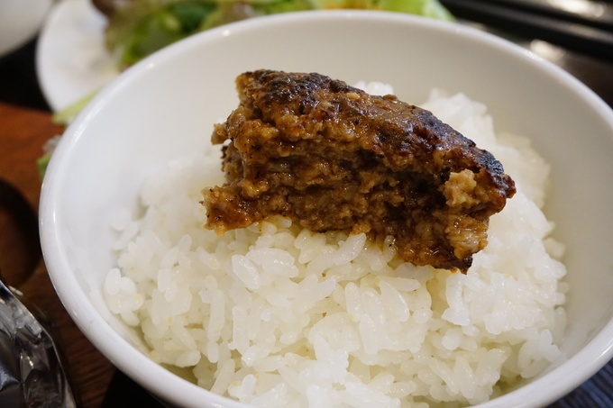 火の通り方はしっかり目。とろ~り系のハンバーグではなく、噛みごたえがあり噛めば噛むほど肉汁が溢れ出るタイプです。