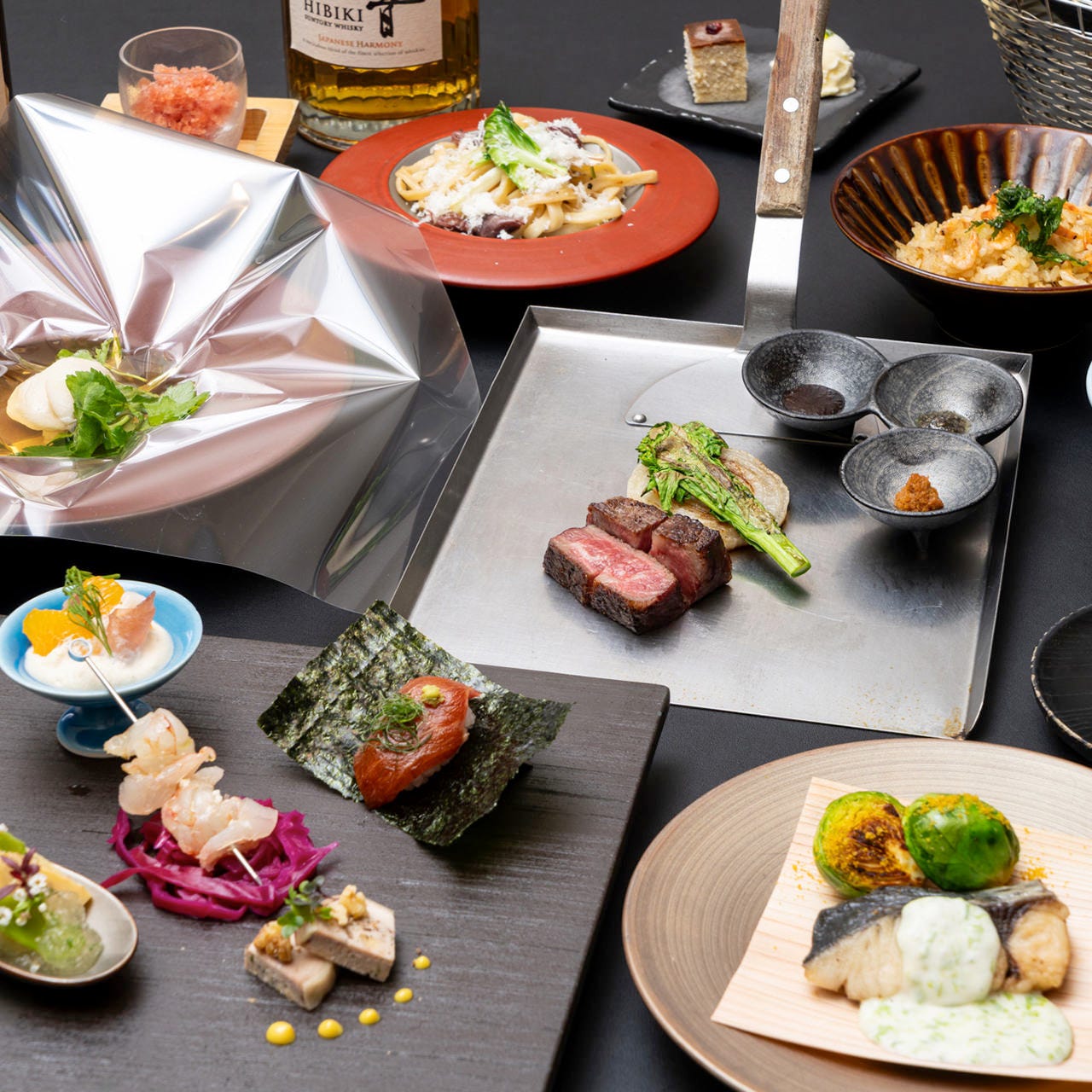 目の前の鉄板で焼き上げる黒毛和牛ステーキをはじめ、15品が並びます。
