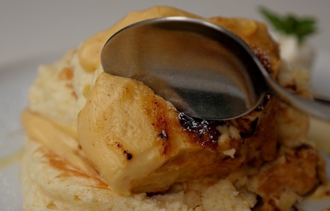 スプーンですくえる柔らかさ!濃厚な卵の味わいを楽しめる「ブリュレパンケーキ」