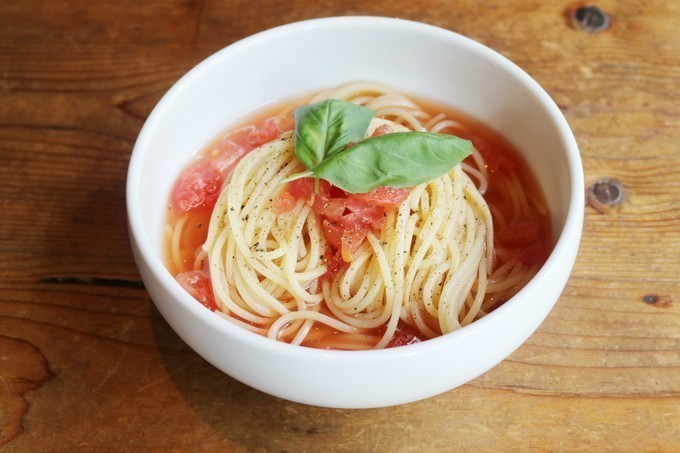 牛出汁とフレッシュトマトを合わせたスープに生パスタを絡め、仕上げています。