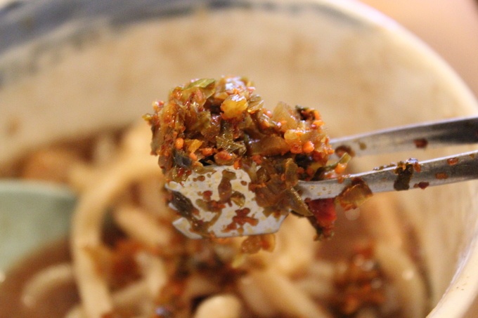 味変には辛子高菜を。少量でピリリと辛いので入れすぎ注意です!