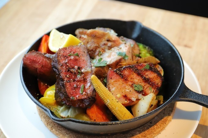 鉄板に盛られて提供されるので、お肉の下には色鮮やかな野菜が豊富に敷き詰められています。