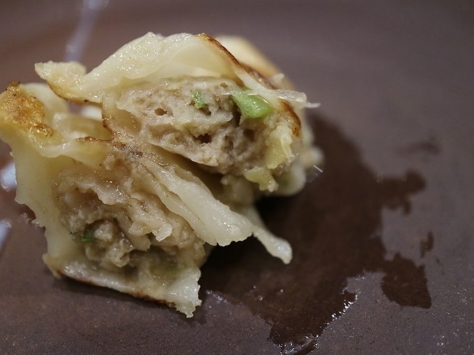 餡の黒豚と脂の甘味が、香ばしい皮に包まれています。割ってみるとジューシーな肉汁が溢れてきますよ。