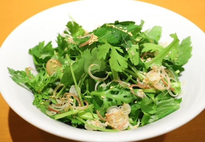 前菜としても、お肉の合間の箸休めとしても是非味わっていただききたいのが「和の香菜サラダ」です。