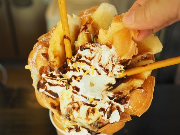 たこ焼き器のような機械で作られたワッフルは、プチプチと丸く膨らんでいるのが特徴。
