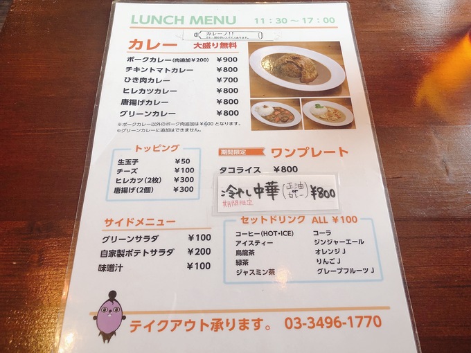 ちなみにランチタイムはカレーの他にもワンプレートランチや、現在(2018年7月時点)は「冷やし中華」の提供も行っています。