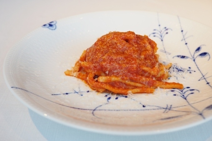 “ピーチ”と呼ばれるイタリア中部の伝統的な太打ちパスタを使用した一品です。