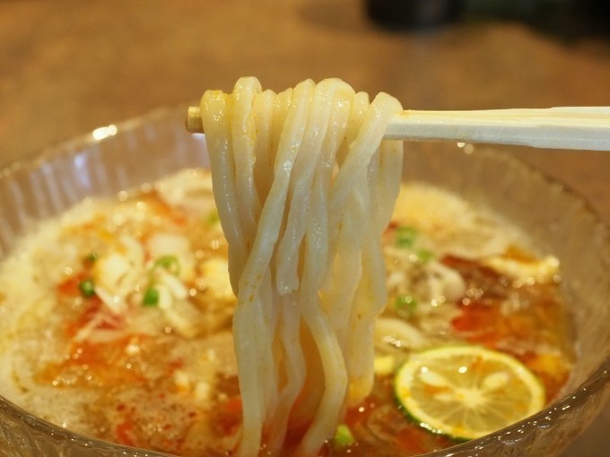 スープは動物×フローズン魚介のWスープ。超冷えてるから超さっぱり!
