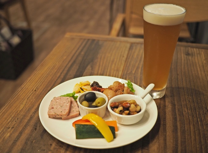 おつまみは「やみつきピクルス」「オリーブの盛り合わせ」「ナッツのメープルシロップ漬け」「てりやきチキン」「ミックスドライフルーツ」「ハーブ香るパテ・ド・カンパーニュ」の6種類。