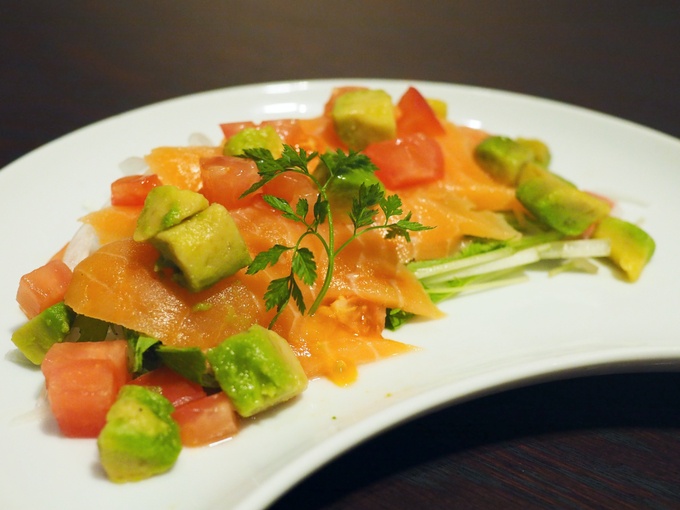 脂がたっぷりとのったサーモンとアボカドのカルパッチョ。