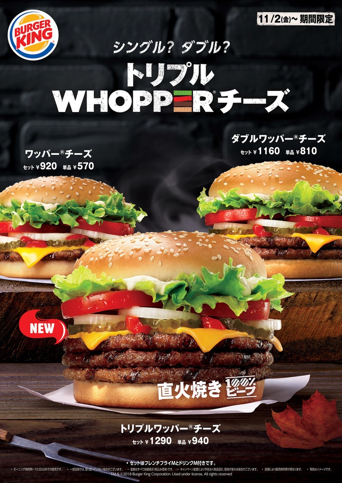 2018年11月2日〜12月6日までの期間限定で、全国の『バーガーキング』に「トリプルWHOPPERⓇチーズ(トリプルワッパーチーズ)」が登場!
