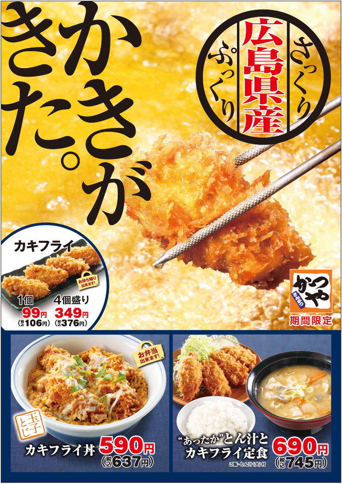 全国の『かつや』にて「カキフライ」フェアが開催中。『かつや』でのカキのフェアは2年ぶり。ぷっくりとした広島県産のカキを特製パン粉でさっくり揚げたカキフライで旬の味わいを楽しみましょう! なくなり次第終了なので、お早めにどうぞ。