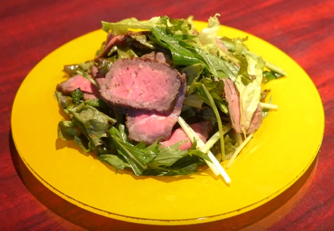 薄く切った自家製ローストビーフを、サニーレタスやクレソンなどの葉物野菜を合わせてサラダにした一品です。