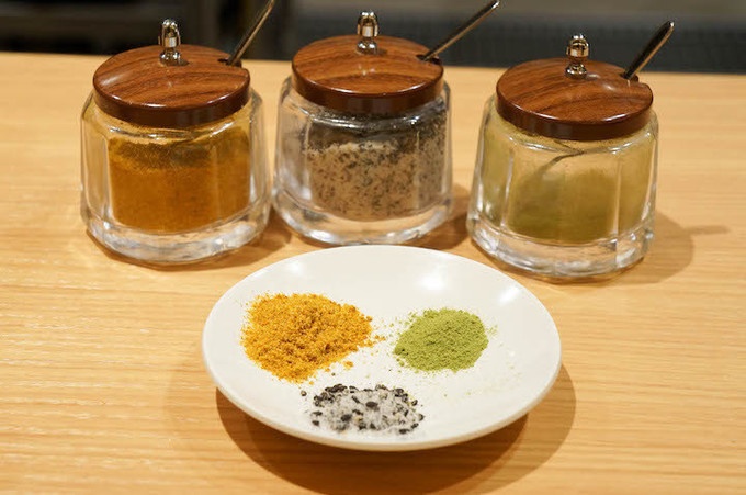 卓上には「抹茶塩・カレー塩・胡麻塩」の3種類が用意されています。