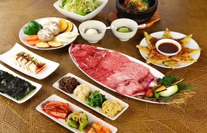 牛タン、カルビ、ロース、ハラミ、豚カルビ、鶏カルビ、ホルモン3種、サラダ、キムチ盛り、チヂミ、ビビンバorライス、わかめスープ、デザート