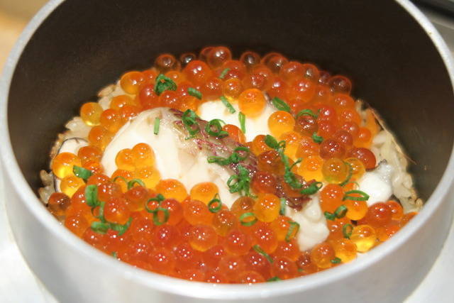 〆には釜炊きのごはんがスタンバイ。じっくり丁寧に炊き上げたごはん、中には鯛とイクラがたっぷり。脂がのった鯛と弾力のあるいくらの食感も楽しみましょう。