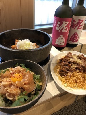左から「鶏ユッケ丼」(480円)、「石焼ホルモン」、「戸越の皿うどん」。名物の石焼ホルモンは味噌ダレの辛さを選べる