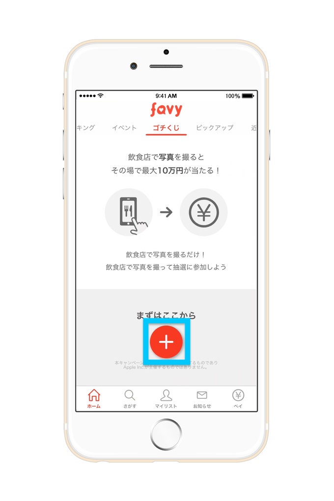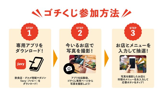 ゴチくじは、飲食店で写真を撮ると最大10万円が当たるサービスです!全国すべての飲食店で参加することができ、お店に来店したときにfavyアプリを使って写真を撮影すると応募することができます。
