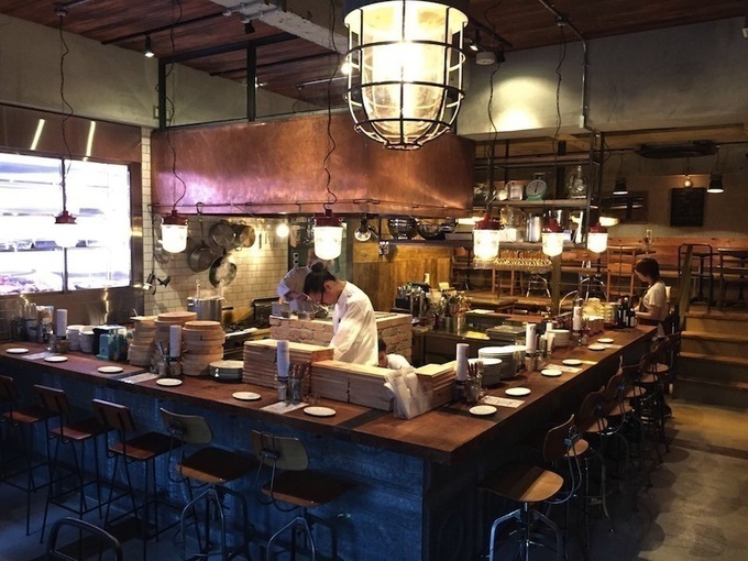 どこか懐かしいノスタルジックな雰囲気を感じさせる空間を手掛けるのは、同社デザイナーの加藤幸江氏。活気ある店内の様子が見える格子ガラスのファサード、古材を貼った天井に吊るされたアンティークランプの柔らかい灯り、風合を生かした建材を用いたレンガ造りの壁や銅板にエイジング処理をしたレンジフードなど、女性デザイナーがつくる男らしい空間に仕上がっている。店内の中央には、「料理人のステージ」となるキッチンが設けられている。料理人と同じ目線の高さで一体感を味わえるキッチンを囲むコの字型のカウンター席をアリーナ席とすれば、店内が見渡せるように高さを設けた奥のテーブル席は、スタンド席のようである。そして、キッチンステージの真ん中に鎮座する大きな炭火の焼き台では、臨場感たっぷりに塊肉が焼き上げられるのだ。
