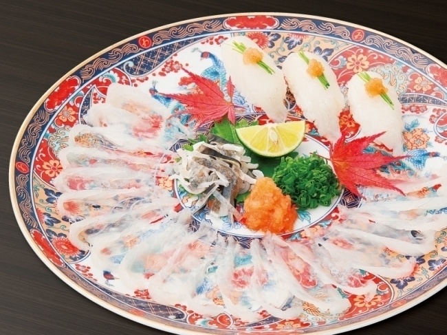 薄造りと握りでフグを味わい尽くす、圧巻のひと皿です。