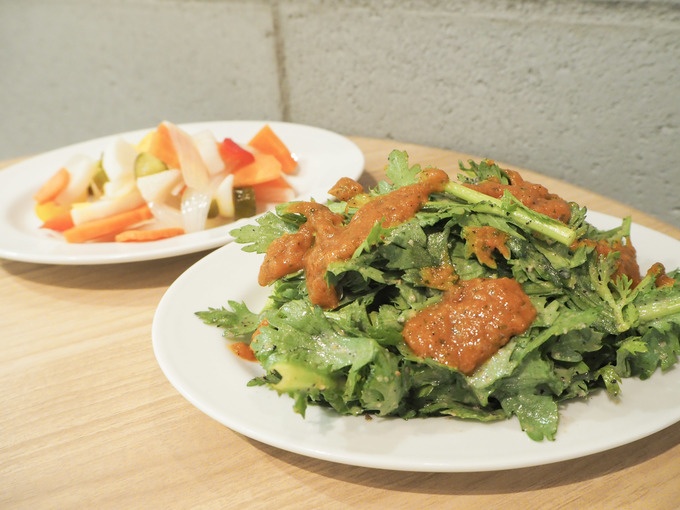 春菊を酸味のあるドレッシングで和え、上からサルサソースを掛けた「春菊爆弾サラダ」や、酸味控えめでビールのおつまみにもなる「自家製ピクルス」などが揃います。