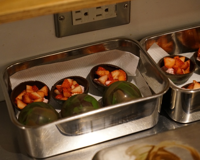 スタッフさんが球状のチョコレートにに熱々のブラッドオレンジソースをかけると、ゆっくりとチョコレートが溶けて、チョコレートの中からなんとイチゴとマシュマロが出てきました。