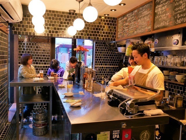 1階はメイン厨房を囲む立ち飲み。作業台と地続きのL字のカウンターがユニーク