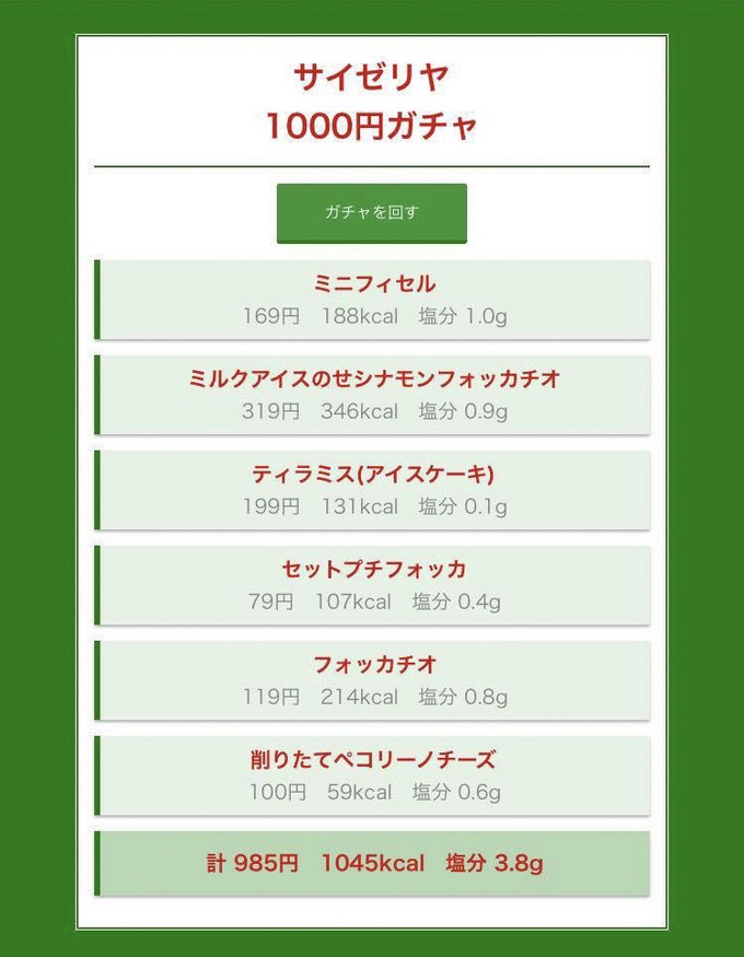 こちらが同僚の「サイゼリヤ1000円ガチャ」の結果画面。