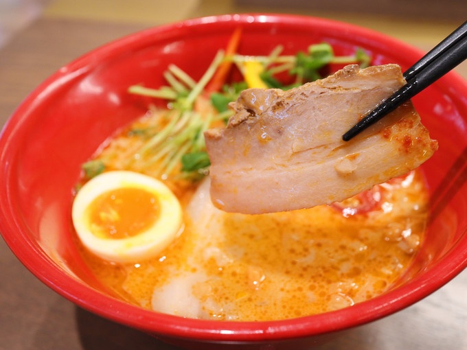 まずいただいたのは、「ベジとんこつ」。赤い丼には、チャーシューに半熟煮卵、たっぷりの野菜がトッピングされていて彩り華やか。