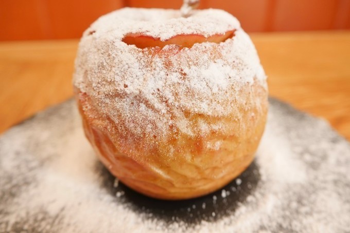 国産リンゴの中をくり抜き、砂糖、シナモン、バターを入れてオーブンで焼き上げています。仕上げにメープルシロップとシナモン、粉砂糖を振ってできあがり。