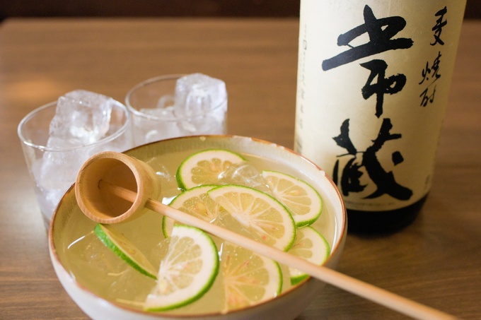 大分の麦焼酎「常蔵(つねぞう)」のロックに、かぼすの薄切りを浮かべた「ウスキボウル」。