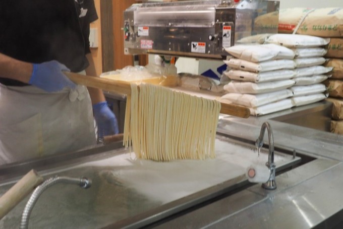 熟成が終わった麺生地は店内で切られ、茹であげられます。